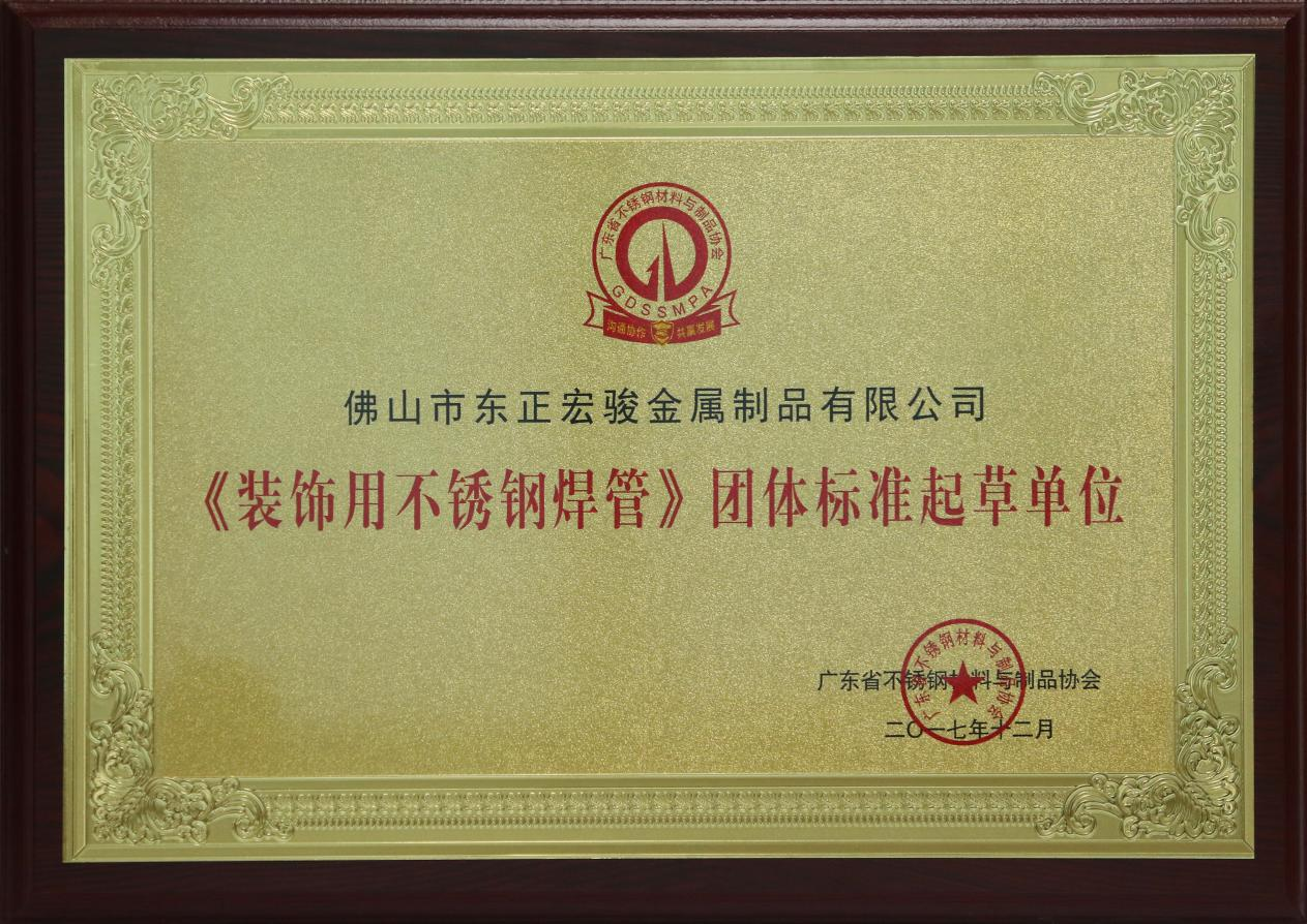 鑒于泓冠不銹鋼一直以來的品質(zhì)堅(jiān)持,在行業(yè)中已經(jīng)樹立起品牌名氣,行業(yè)協(xié)會多年來聘任東正宏駿為《裝飾用不銹鋼焊管》團(tuán)體標(biāo)準(zhǔn)起草單位職位。這是對泓冠不銹鋼的品質(zhì)形象的認(rèn)可,對泓冠不銹鋼來說也是一種特殊的榮譽(yù)。
